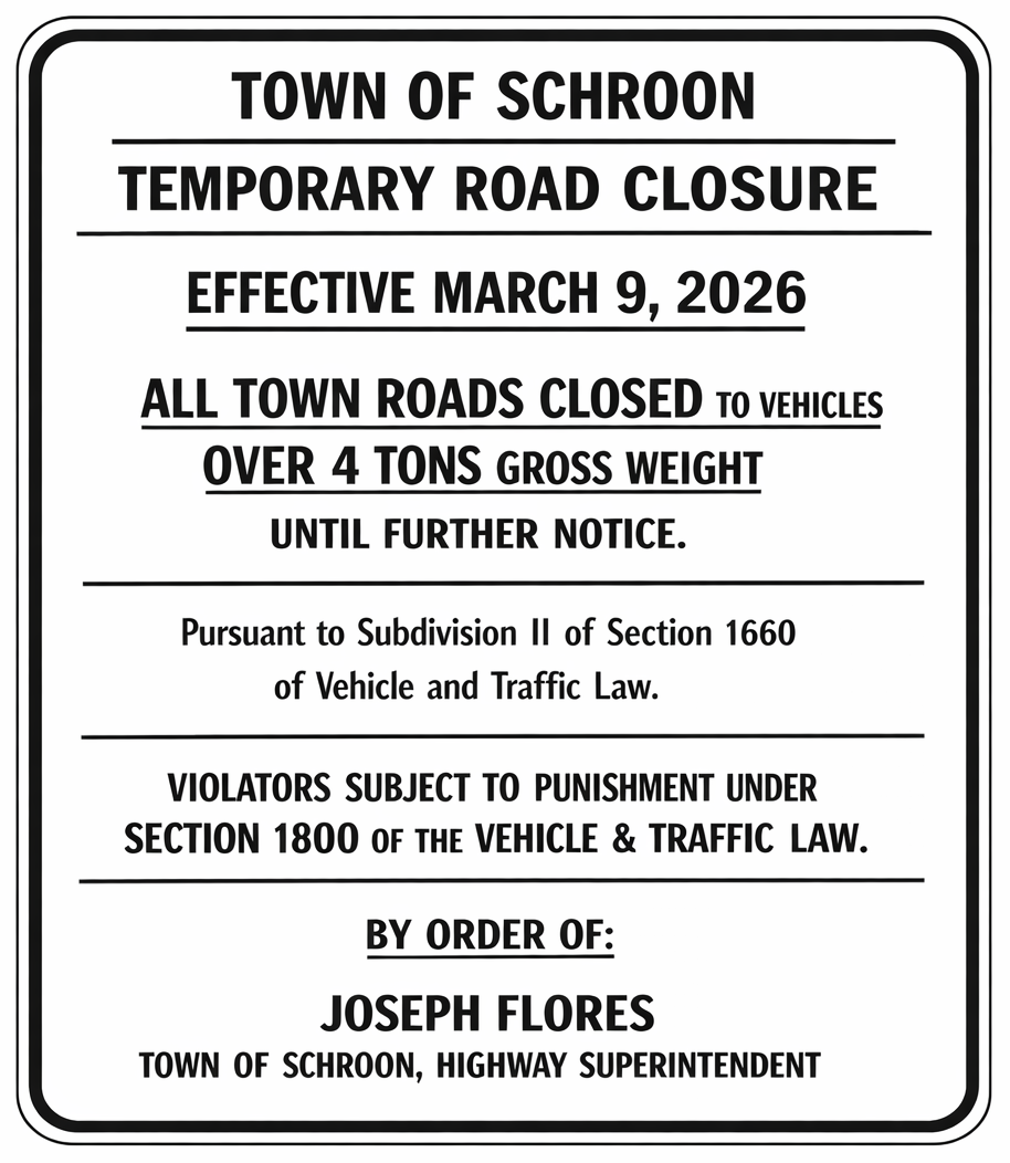 PLEASE TAKE NOTICE that I, Erica D. Hedden, The Undersigned Collector of Taxes of the Town of Schroon, County of Essex, and State of New York, have duly received the tax roll and warrant for the collection of taxes within the Town of Schroon for the year 2026, and that I will attend at the Schroon Town Hall, 15 Leland Ave, Schroon Lake, NY 12870 from January 2, 2026 to April 30, 2026, for receiving the taxes listed on the said roll. In-person payment hourswill be Monday – Friday, 8:00 AM to 2:00 PM except holidays. Online, in Person and Mail in payments are accepted.